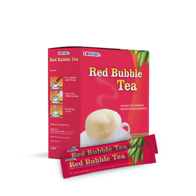 Edmark's Red Bubble Tea, inspired by Malaysia's "Teh Tarik," offers a refreshing pause during your day. Meticulously created from genuine Camellia Sinensis (tea) leaves and enriched with Red Yeast Rice extract, this unique blend strikes the right balance of antioxidants, supporting overall health and cholesterol balance.