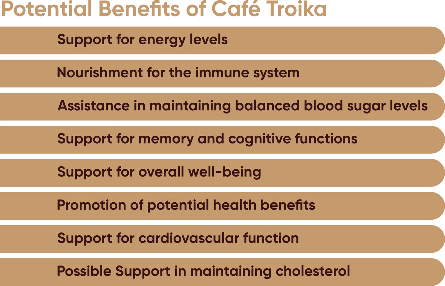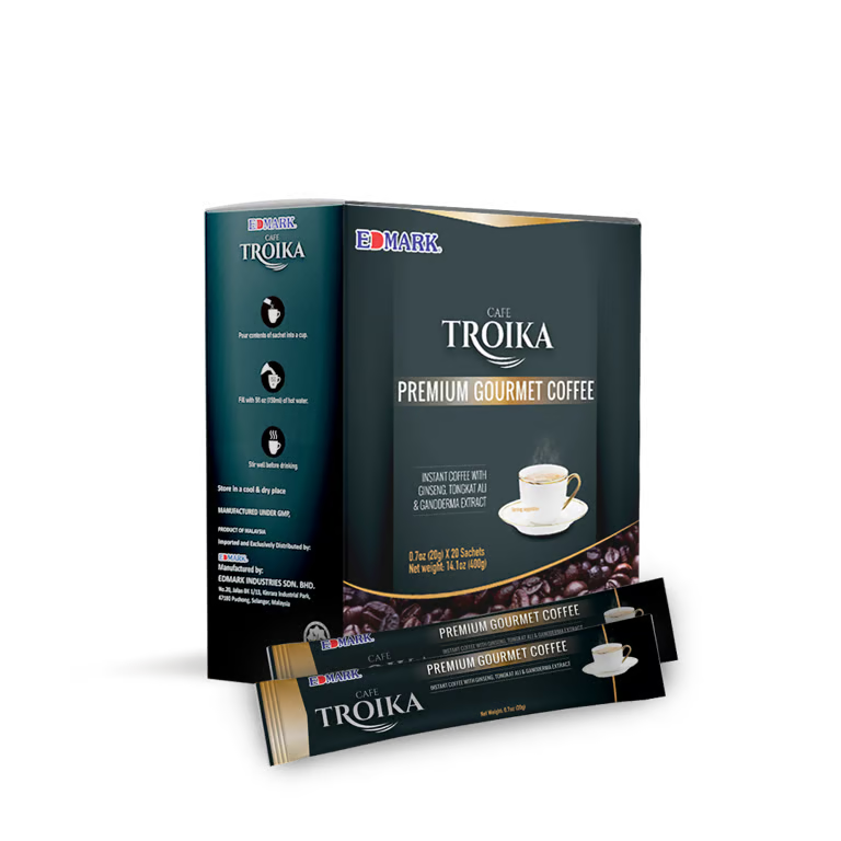 EDMARK Cafe Troika seamlessly combines the invigorating essence of coffee with the added benefits of Ginseng, Tongkat Ali, and Ganoderma
